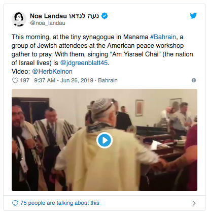Among those participating was Jason Greenblatt, Washington’s Mideast mediator and one of the architects of the “Peace to Prosperity” workshop taking place here. Aryeh Lightsone, a top aid to US Ambassador to Israel David Friedman, gave a brief “dvar torah” after the services. Rabbi Marvin Hier, the fonder and dean of the SImon Wiesenthal Center, led the services.
