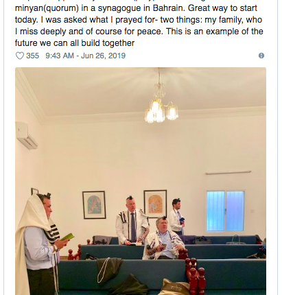 This was not your usual minyan: Not everyday is “Am Yisrael Chai” sung in a Persian Gulf synagogue.