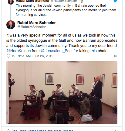 Houdie Nonoo, Bahrain’s former ambassador to the US and a member of the tiny Bahrani Jewish community, was also on hand — she opened the shul — and said she was “moved.”
