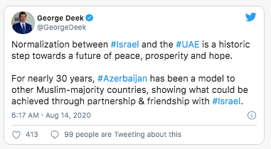 “Normalization between #Israel and the #UAE is a historic step towards a future of peace, prosperity and hope,” wrote George Deek, Israeli ambassador to Azerbaijan on Twitter on Friday. “For nearly 30 years, #Azerbaijan has been a model to other Muslim-majority countries, showing what could be achieved through partnership & friendship with #Israel.”