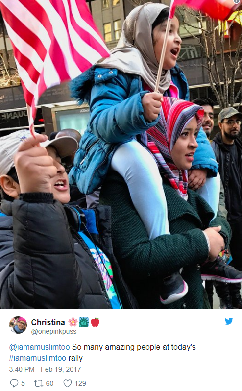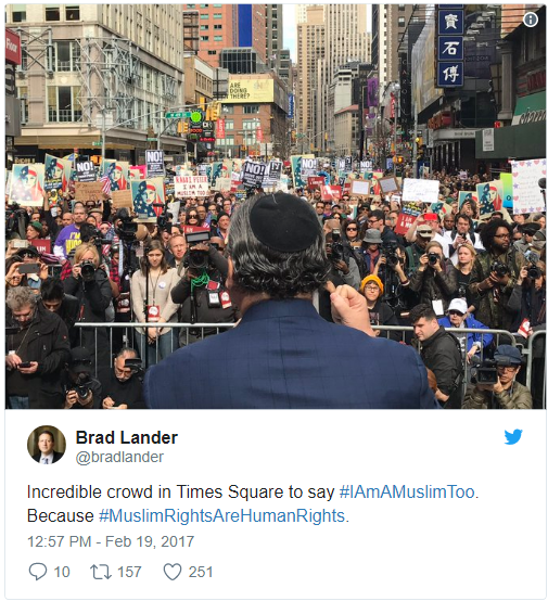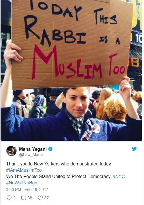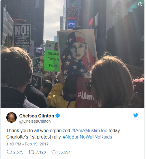 Clinton tweeted that it was the first time 2-year-old Charlotte Clinton Mezvinsky had joined a protest. She certainly picked a good one. AM New York reports that about 1,000 people rallied in Times Square today in a show of solidarity with NYC’s Muslim community in the aftermath of President Trump’s actions against Muslims. Chelsea Clinton was a proud participant in today’s #IAmAMuslimToo protest, and she brought her daughter along.