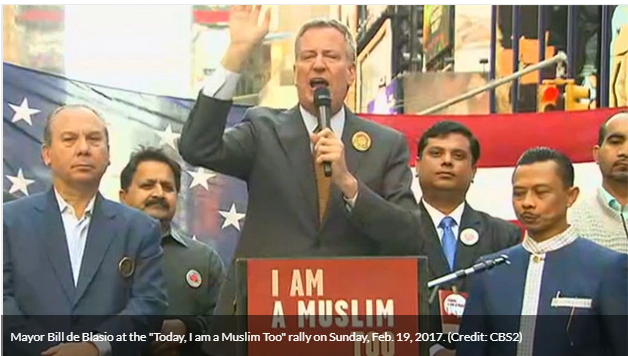 “Here’s the message I want to give as mayor of this city, to everyone who’s here. Regardless of your faith or your background or where you were born, this is your city,” de Blasio said. “And to everybody, this is your country too. This is your country too. And think about the origins of this country – a country founded by people fleeing religious persecution. A country founded to respect all faiths and all beliefs. This is who we are as Americans, and this must be protected.”