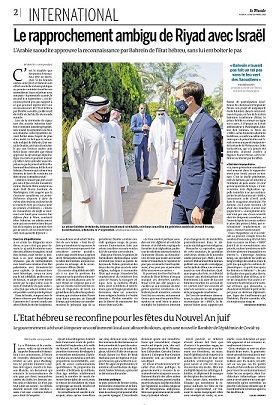 « Bahreïn n’aurait pas fait un tel pas sans le feu vert des Saoudiens, estime Husseïn Ibish, analyste au Arab Gulf States Institute de Washington. Cela suggère que la Couronne saoudienne est potentiellement disposée à faire de même dans le futur, en fonction de la manière dont ça se passe pour les Emirats et Bahreïn. »« Toutes les monarchies du Golfe se tournent vers Israël pour assurer leur défense face à l’Iran, renchérit Marc Schneier, un rabbin américain qui a ses entrées dans les palais de la région. La question n’est pas de savoir s’ils reconnaîtront Israël, mais quand ils le feront. »