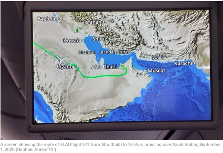 “This flight records two significant events in the history of the State of Israel and in the region heralding another step towards regional peace — for the very first time an Israeli-registered aircraft will overfly Saudi Arabia and after a nonstop flight from Israel, land in the United Arab Emirates,” he said, first in English and then in Hebrew.