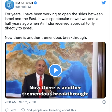 “For years, I have been working to open the skies between Israel and the East. It was spectacular news two-and-a-half years ago when Air India received approval to fly directly to Israel,” he said in a filmed statement, standing near a huge map.