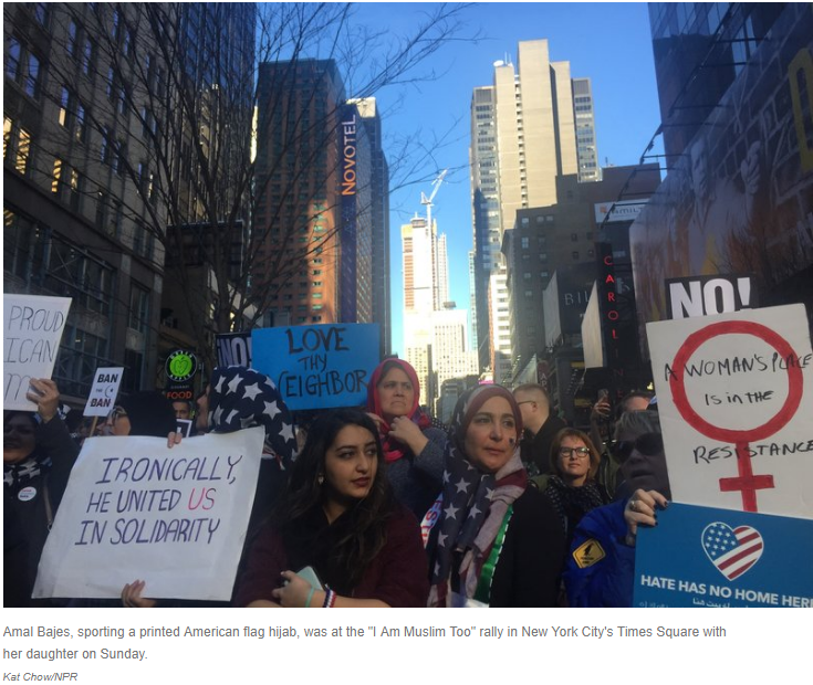 At a rally in New York City’s Times Square on Sunday, protesters filled three city blocks to express solidarity with Muslims. The crowd gathered to speak out against President Trump’s executive order — now on hold after a unanimous federal appeals court decision — banning immigration from seven predominantly Muslim countries.