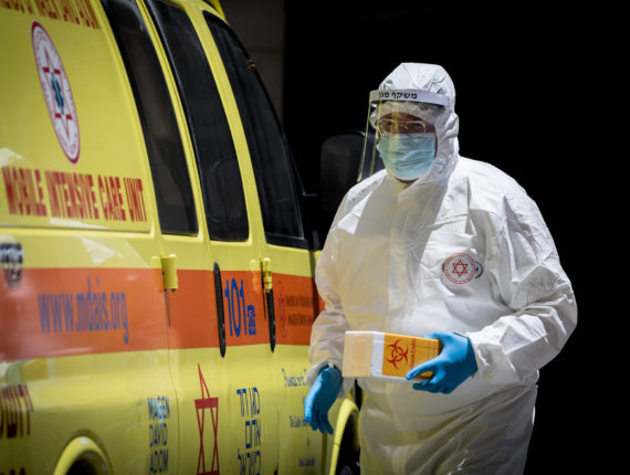 A Magen David Adom worker arrives to test a patient with symptoms of coronavirus in Jerusalem on June 23, 2020 (Yonatan Sindel/Flash90)