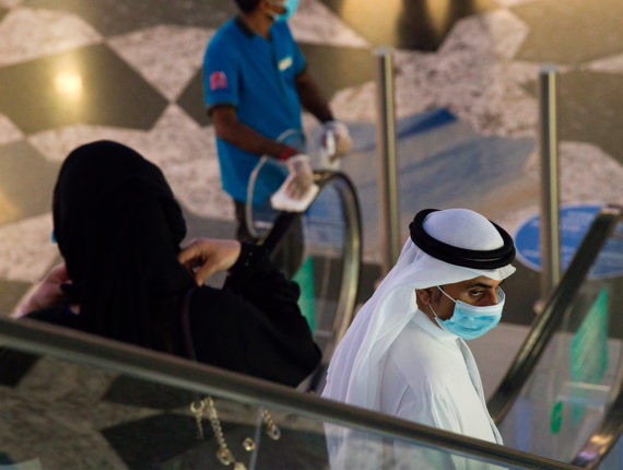 An Emirati man and woman ride an escalator at Mall of the Emirates in Dubai, United Arab Emirates, as the country loosens its coronavirus restrictions, May 27, 2020. (AP Photo/Jon Gambrell)