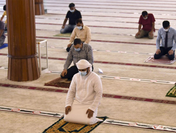 Worshipers practicing social distancing at a mosque in the emirate of Sharjah in the United Arab Emirates, July 1, 2020. (Karim Sahib/AFP)
