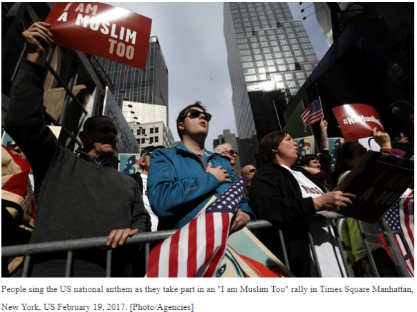 About 1000 New Yorkers rallied in Times Square, dubbed as the Crossroads of the World on Sunday, to show solidarity with New York City’s Muslim community, protesting US President Donald Trump’s immigration policy.