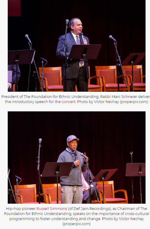 The concert was conceived and Music Directed by NYTF Artistic Director Zalmen Mlotek and featured THE GOLDEN BRIDE’s Lisa Fishman, renown cantor and trumpeter Magda Fishman, international opera and Broadway sensation Elmore James and recording artist Tony Perry. This incredible concert was kicked off with special appearances by hip-hop pioneer Russell Simmons of Def Jam Recordings and Rabbi Marc Schneier.