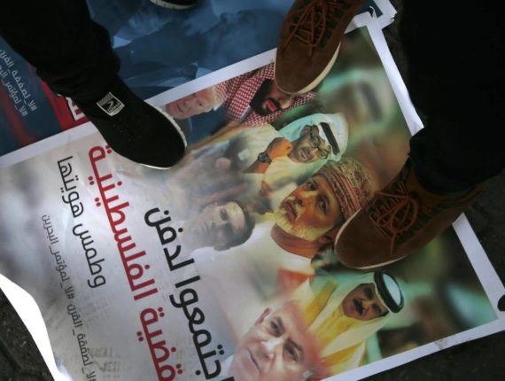 Palestinians step on a placard displaying pictures of Bahraini King Hamad al-Khalifa, Israeli Prime Minister Benjamin Netanyahu, US President Donald Trump and his son-in-law and adviser Jared Kushner, during a protest. ( Getty )