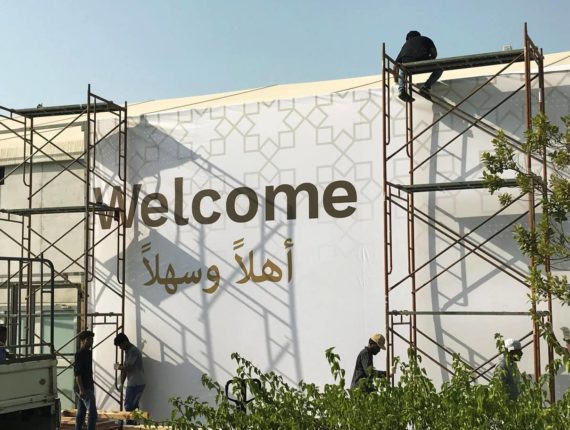 Workers place a banner at the pavilion where the US hosted event “Peace to Prosperity” takes place outside Four Seasons Hotel in Manama