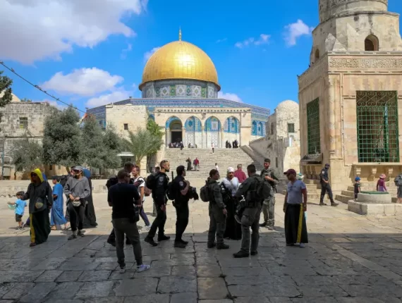 Israeli security forces guard while Jews and tourist visit the Temple Mount, in Jerusalem’s Old City, August 28, 2023 (credit: JAMAL AWAD/FLASH90)