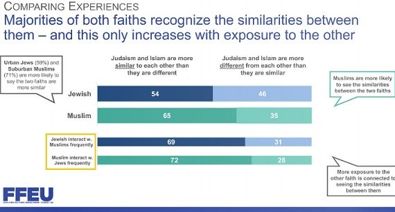 The poll conducted by the FFEU revealed 65 percent of Muslims and 54 percent of Jews responded that Islam and Judaism are much more similar than different. The Jews who had more exposure to Muslims hold the view that Islam is an inclusive religion. They believe Islam is much more progressive compared to Jews who do not interact with Muslims much. Mosque and synagogue “twinning” schemes are run by the FFEU and several other interfaith activities for Muslims and Jews.